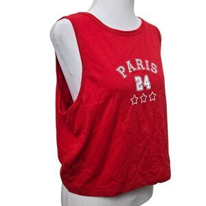 This tank top is a sleeveless, cropped red top with a sporty and casual aesthetic. It features a bold "PARIS" text across the chest, a "24" below it, and three stars underneath, giving it a varsity or athletic-inspired look. The neckline and armholes are finished with matching red trim.
