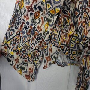 Fourteenth Place long sleeved boho top with ikat design and tie front. Keyhole opening in back. EUC