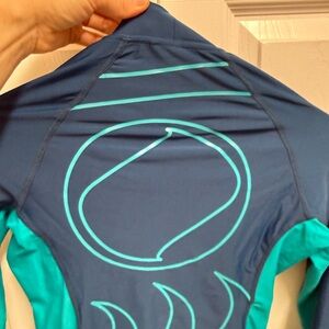 Size 8 kids. Turquoise and teal longsleeve rash guard. Stretch material. Meant to be worn fitted. GUC.