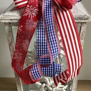 Mix Of Red, Blue, & White Ribbons. This Bow Is In Stock Ready To Ship. Wired Ribbons. I Have Attached Floral Wire Ready For You To Attach For Easy Hanging. This Listing Is For The Bow Only. Lantern Is Not Included. Great For Fourth Of July!! It Weighs 4 Ounces. I Have More Bows To View Under My Listings. Thanks For Checking Out My Shop!