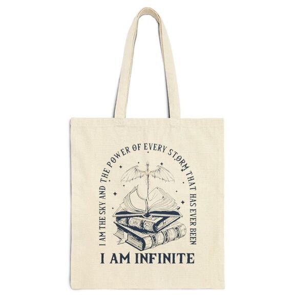 New. “I Am Infinite” Fourth Wing canvas tote. Material: 100% cotton. Lightweight and compact. Measuring at 15.75"h x 15.25"w and with a handle length of 21.5”. *Reasonable* offers welcome.