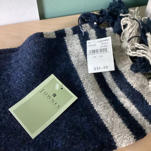 Navy blue scarf with gray stripes. Blue and gray tassels. 67 in long. 8in wide