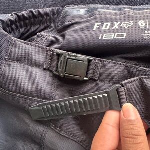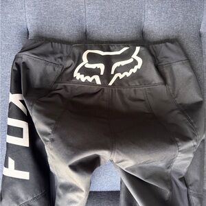 Fox Racing 180 motocross riding pants in black with large FOX logos. Designed for dirt biking and off-road riding with durable material and leather inner knee panels for grip and heat protection.