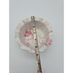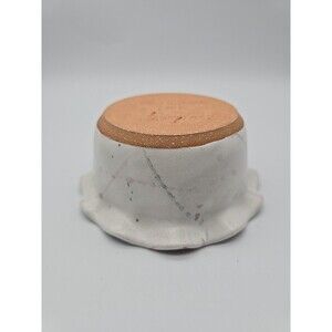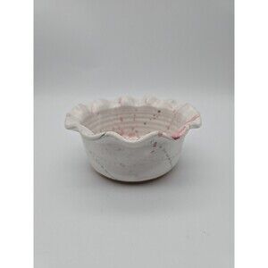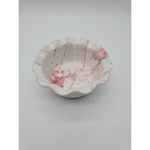 The Fox Creek Apple Baker is a vintage piece of pottery signed by the artist in 1992. It is white with splatters of pink and green.
