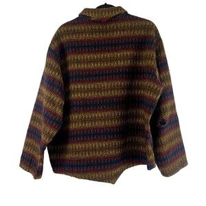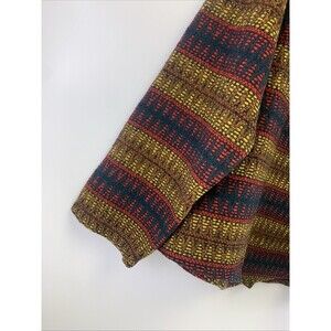 Unique item but has a large hole on sleeve. Navy blue, brown, red pattern striped print. Two button.