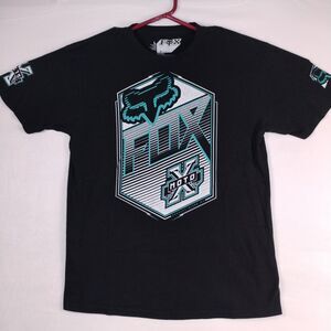 Fox Moto X Motorcross Double Sleeve Hit T-Shirt Men's Size Large- This cool T-Shirt features a large, teal & white Fox Moto X graphic on front as well as graphic hits on each sleeve. T-Shirt is a Men's Size L (Large). Approx. measurements are 20 inches across the chest and 28 inches from collar to cuff. T-Shirt is a 50/50 Cotton and Polyester blend and was made for Fox in Mexico. T-Shirt is in Very Good Condition with minor wear. Please see pictures for Condition Concerns. Ships Nationwide with USPS Ground Advantage Mail. Thanks for looking and God Bless!