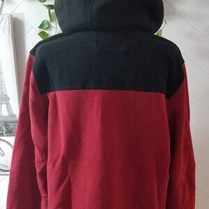 Heavyweight material, secret pocket inside the kangaroo pocket. Original purchased at a booth.