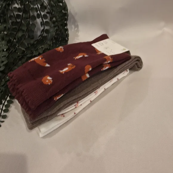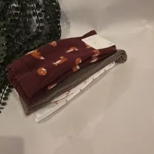 Set of socks featuring a cute fox pattern. Includes maroon, brown, and white colors.