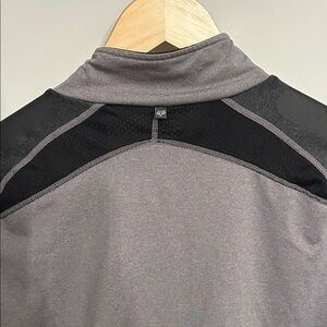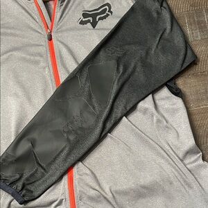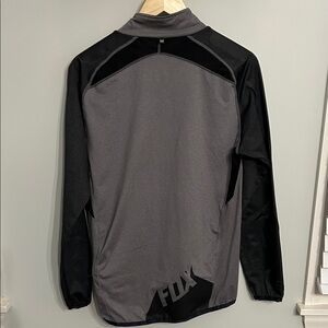 Dynamic Fox jacket with a gray body. Black sleeves and red zipper enhance style. Ideal for active wear.