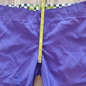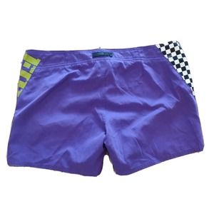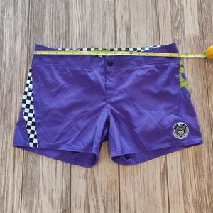 Stylish purple swim shorts by Fox. Features checkered side panels. Comfortable and trendy design.