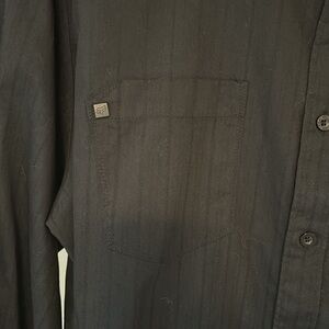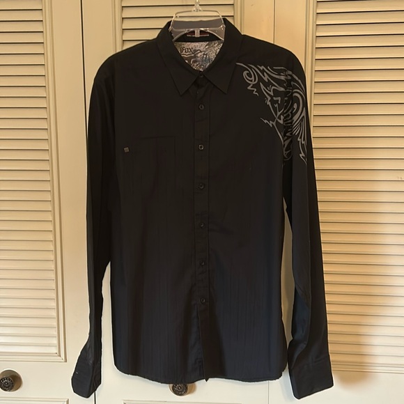 Black button down shirt with silver/gray design on left.