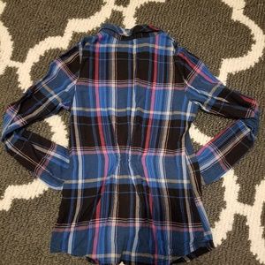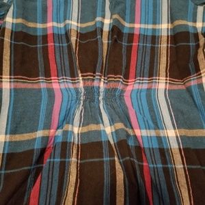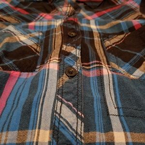 Blue, pink, and black flannel. Has elastic on back for a more fitted look.