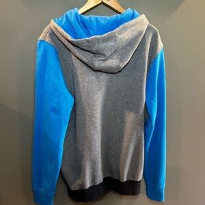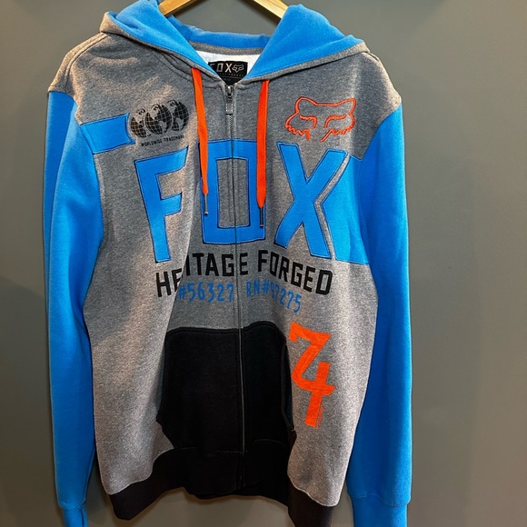 Fox hoodie featuring a gray and blue design. Bright orange accents add a pop of color. Comfortable and stylish.