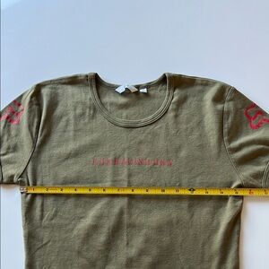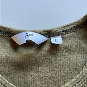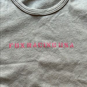 Cute short sleeve olive green tee featuring bold red Fox racing graphics. Size L but snug for that size, see pics for measurements. Tried on but never wore.