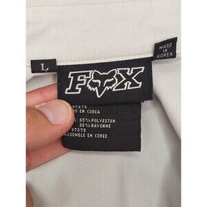 The Fox Racing Shirt for men in size L features a white and blue solid pattern with a collared neckline and short sleeves. Made from a comfortable polyester blend fabric, this button-up shirt is perfect for casual occasions with its embroidered logo accents and convenient pocket design. With a classic motorcycle and outdoor theme, this regular fit shirt by Fox is suitable for all seasons and easy to care for with machine washable instructions. Made in Korea, this shirt offers a stylish and versatile option for men's clothing.