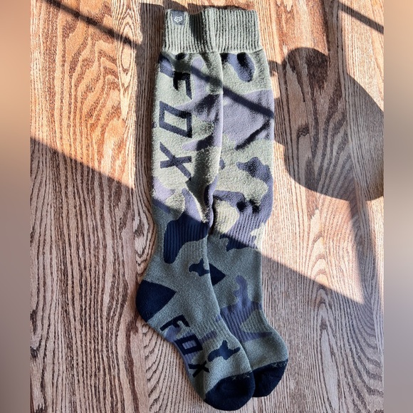 Tall Fox racing socks. Put on and my husband doesn’t really like this style of socks with his boots because of a skin graft.