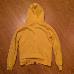 Zip up. Very nice, heavy sweatshirt. Very soft inside. Only worn a few times. Nothing wrong with it.