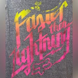 Grey Fox Racing with “faster than lightning” on front in orange, yellow and pink. This is a high-low cut and it is longer in the back than the front. Size M. Very good condition with no stains or tears! Offers accepted (: