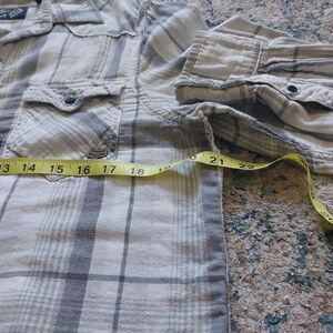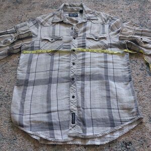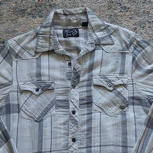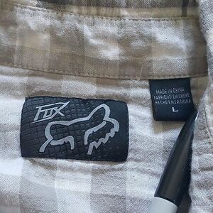 Fox Racing White & Gray Plaid Western Style Flannel Shirt Men's Size Large. Please see pictures for condition and measurements for proper sizing and fit.