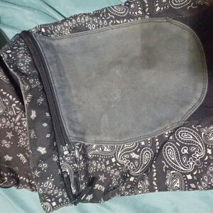 Heat and abrasion resistant leather knee panel on right leg.
