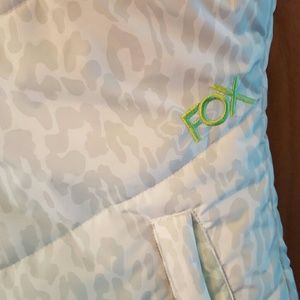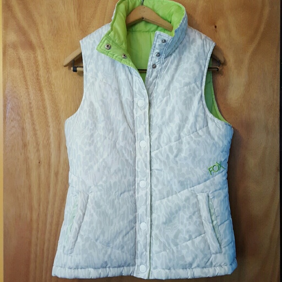 Reversible riding vest white and gray cheetah print on one side and lime green on the other. Worn a handful of times. Great condition. Wonderful for fall or cooler weather with the puffer style vest also great for motorcycle riding.