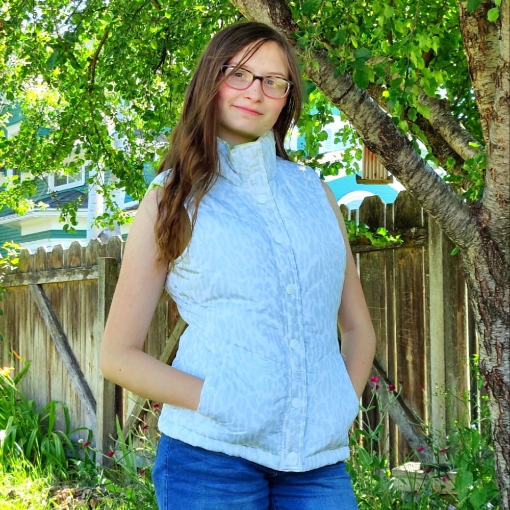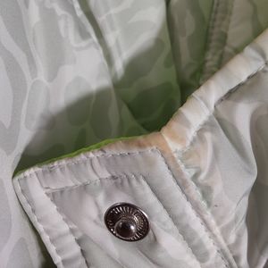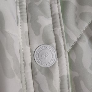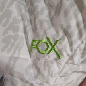 Super trendy puffy vest! Lime green on one side and a light gray cheetah print on the other with the fox logo mixed in! All snaps in great shape! One small stain as shown in last photo.