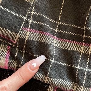 Cute grey,black and plaid print. Lined with faux black fur. Small white spot near the bottom right pocket as shown in picture. Size small.