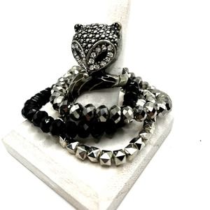 Detailed adjustable fox ring with 3 matching bracelets. Set includes colors in antique muted silver tones, shiny chrome tones, rhinestones and black accents. All 4 pieces are adjustable or expandable for versatility.