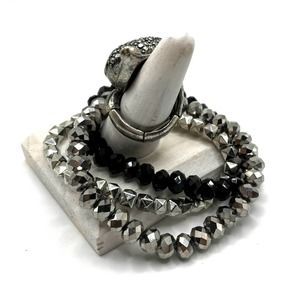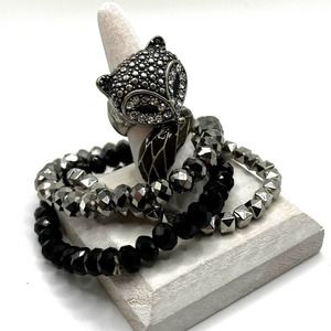 Fox Ring & 3 Stretch Bracelets Antiqued Silver Tone & Black Costume Jewelry
