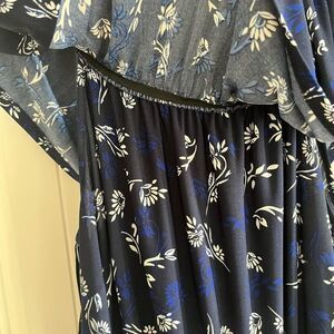Very long flowy maxi with flutter type sleeves, has elastic and can be worn off the shoulder, empire waist , side split