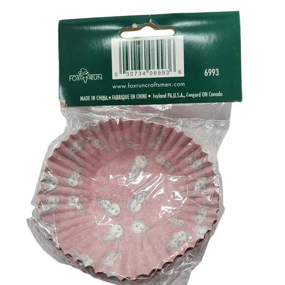 Features red cupcake liners with adorable snowmen on them, packages of 50 baking cups, 4 packages for 200 total baking cups, made by Fox Run, made in China