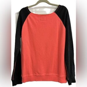 Vibrant coral pullover by Fox. Black accents. Comfortable and stylish. Can be worn off the shoulder