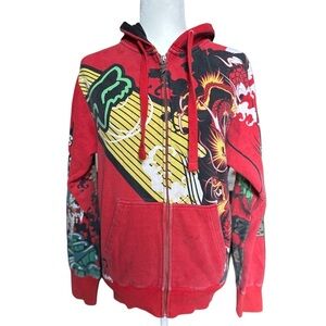 Fox Vintage Y2K Racing Dragon Print Ed Hardy Style Blossom Red Hoodie Size Small