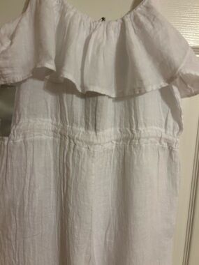 Lightweight linen cami with ruffled front detail. Sleeveless design for warm days. Simple and airy silhouette. Drawstring waist. Sheer linen. Has pockets. Never worn. Measurements, Bust-19”, Waist-16, Hips-19”, Length -52”