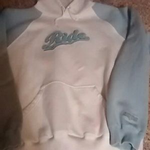 White with baby blue sleeves fox on right wrist area Ride in baby blue on whit part of hoodie.