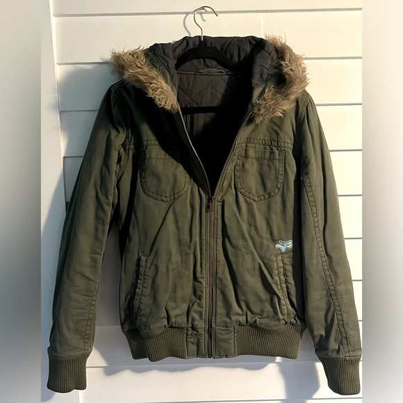 Green FOX utility jacket. Faux fur trim on hood , grey interior . Purchased from zumiez .