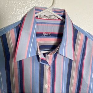 Great condition. Foxcroft. Button Down Shirt. Pink, blue, white and gray stripes. Wrinkle free. Would be great for a gender reveal! Size 10 Petite. 60% cotton, 40% polyester. Pit to pit laying flat 20” Shoulder to hem 26.5” Sleeve (seam to hem) 23”. All measurements are approximate and taken lying flat. Smoke free home. No trades, offers welcome.