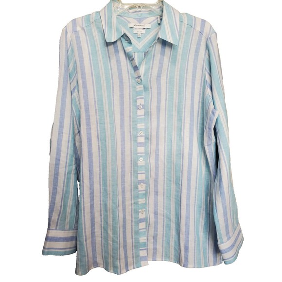 This is a Foxcroft Easy Care Relaxed Linen Blue Striped Long Sleeve Button-Up Tunic Sz 16