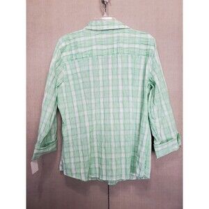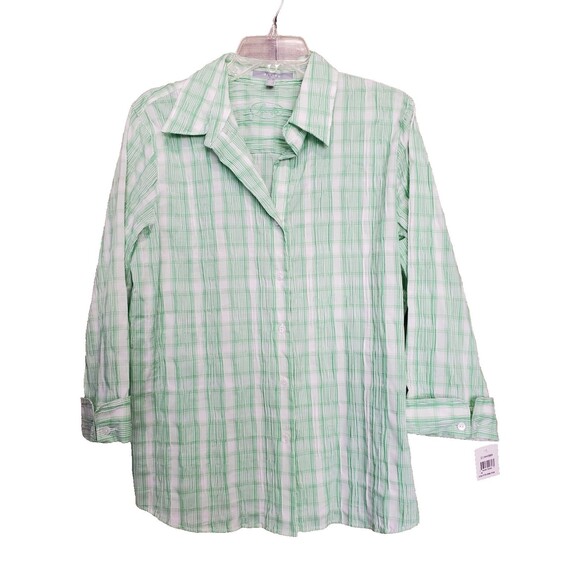 This is a Foxcroft Fitted Crinkle Plaid Green 3/4 Sleeve Button-Up Top Size 16 NWT