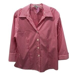 Foxcroft pink and white gingham 3/4 sleeve wrinkle-free fitted blouse, Size 12