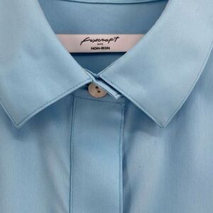 Features: Hidden buttons down the front. Collared. Long sleeve. Chest pocket.