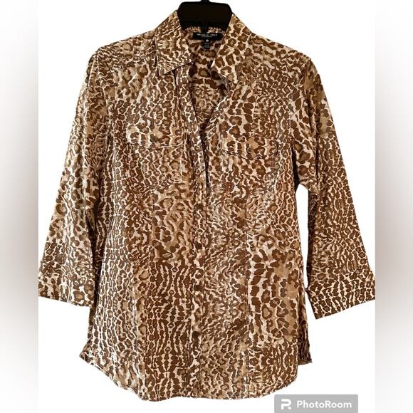 Foxcroft NYC Button Up Blouse Leopard Print Cotton NWT Brown White size 4 with 3/4 sleeves.