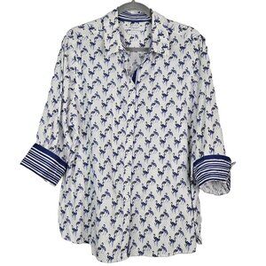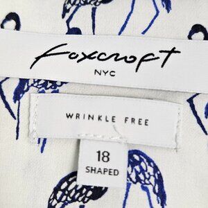 Foxcroft NYC Wrinkle Free Button Front Contrast Cuff 100% Cotton Shirt in Black/Blue Flamingo Print, size 18 Shaped. 3/4 sleeves with fold over contrasting blue/white stripe cuffs. Rounded hem. Excellent pre-owned condition.