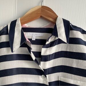 Chic blouse with bold navy and white stripes. Features a classic collar and subtle pink accents.