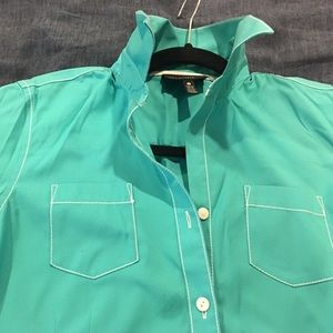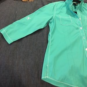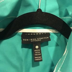 Gorgeous teal color. Foxcroft No Iron fitted oxford shirt. Size 4. Has 3/4 roll tab sleeves. White cotton stitching detail. Cotton