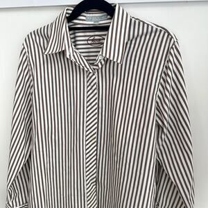 Foxcroft Sz 12 Brown White Stripe Shaped Fit Wrinkle Free Button Down Shirt