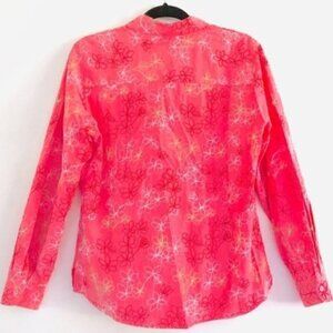 Embroidered flowers on this long sleeve pink button down shaped fit shirt by Foxcroft. Size 8.