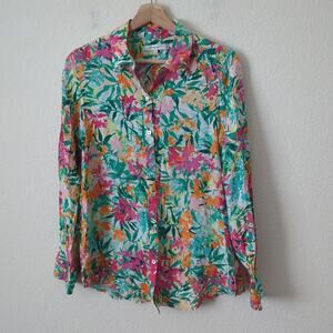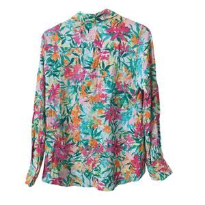 foxcraft NYC size 8 relaxed blouse long sleeve button-down shirts colorful all over floral print multicolor pink blue green 100% rayon lovely Elegance high class! measurements length 27 flat across underarm 21.5 in. Excellent condition without flaws!