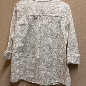 This white blouse from Foxcroft showcases a relaxed, boxy fit with a notched collar, perfect for a casual yet polished look. The lightweight fabric and three-quarter sleeves add to its versatility, making it an ideal choice for various occasions.