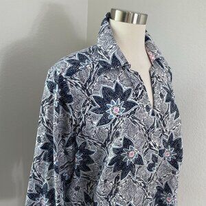 A structured button-down shirt crafted from 100% cotton with a distinctive floral paisley print in navy, white, and blue tones.
